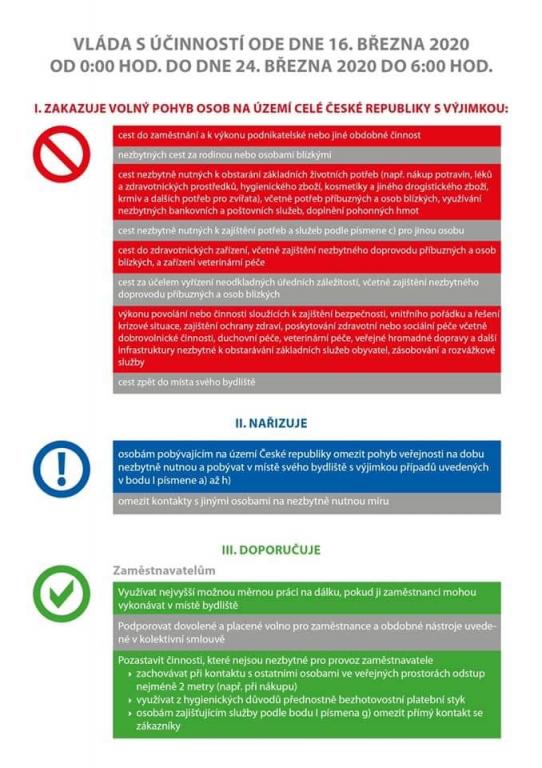 V České republice platí s platností od 16. března 0:00 do 24. března KARANTÉNA. Pro občany to znamená především Zákaz volného pohybu osob na území ČR s těmito výjimkami: