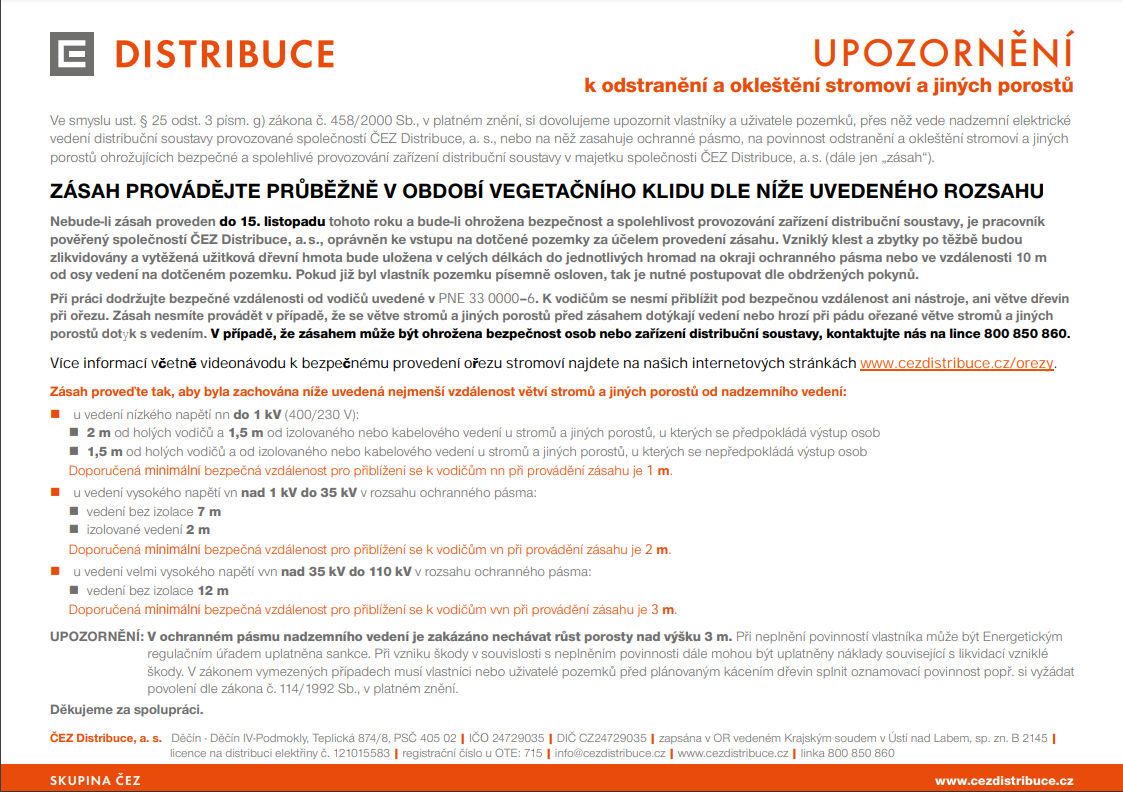Ve smyslu ustanovení § 25 odst. 3 písm. g) zákona č. 458/2000 Sb. (energetický zákon), v platném znění, vyzýváme tímto upozorněním vlastníky a uživatele nemovitostí, přes něž vede nadzemní elektrické vedení nebo na něž zasahuje ochranné pásmo, k pravidelnému odstraňování a oklešťování stromoví a jiných porostů ohrožujících bezpečné a spolehlivé provozování zařízení distribuční soustavy v majetku společnosti ČEZ Distribuce, a. s., jakožto provozovatele distribuční soustavy.