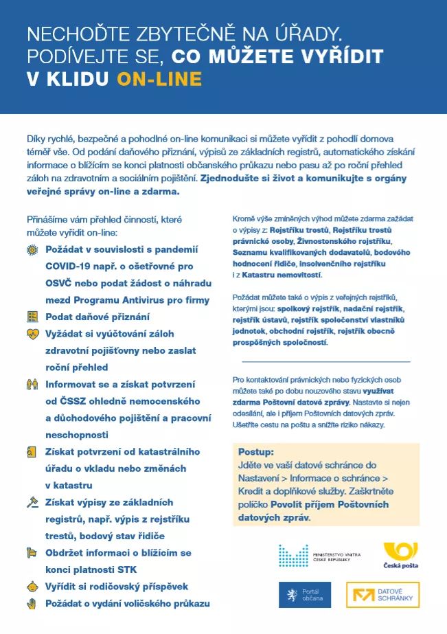 Datovou schránkou můžete jednoduše a se zaručeným podpisem zasílat nejrůznější dokumenty všem orgánům veřejné moci - např. městským, obecním a finančním úřadům, správě sociálního zabezpečení (přes datovou schránku si můžete vyřídit rodičovský příspěvek i důchod) nebo komunikovat se zdravotní pojišťovnou bez nutnosti navštívit podatelnu úřadu nebo poštu. Přístupové údaje do datové schránky zároveň slouží jako prostředek k ověření vaší identity, a tak nahrazují úředně ověřený podpis, který pro mnoho žádostí člověk potřebuje.