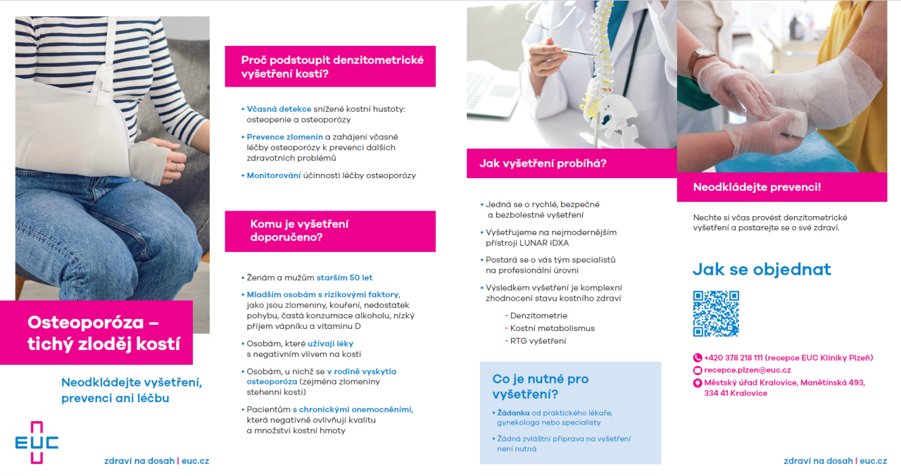 EUC Klinika Plzeň nabízí nově od 5. května denzitometrické vyšetření v populačním screeningovém programu na novém pracovišti v Kralovicích – viz příloha.