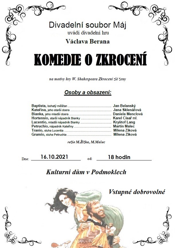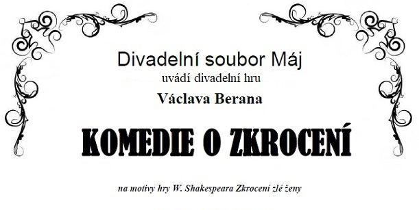 Zveme Vás 16.října od 18 hodin do KD Podmokly na divadelní hru Komedie o zkrocení. Divadelní soubor Máj uvede hru Václava Berana na motivy hry W.Shakespeara Zkrocení zlé ženy.