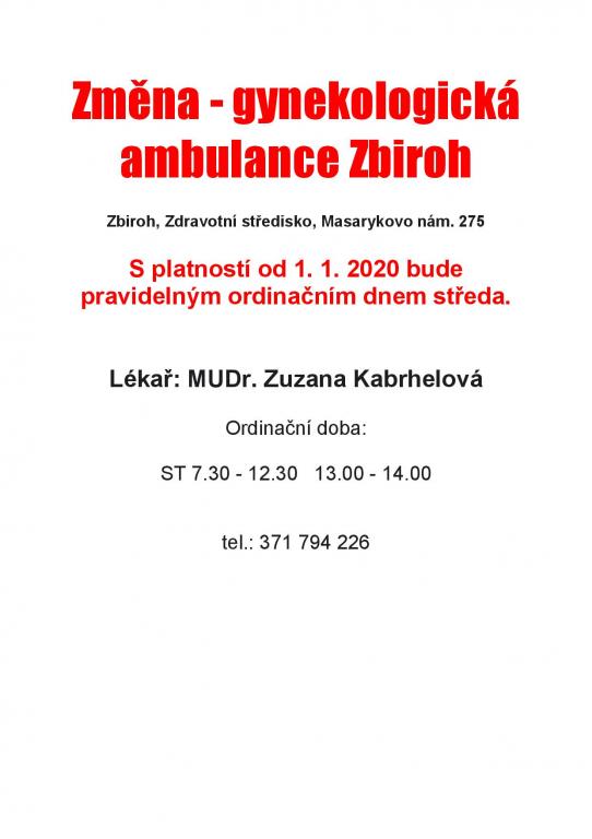 S platností od 1.1.2020 bude pravidelným ordinačním dnem středa. Lékař: MUDr.Zuzana Kabrhelová Ordinační doba: středa 7:30 - 12:30 a 13:00 - 14:00. tel.371 794 226