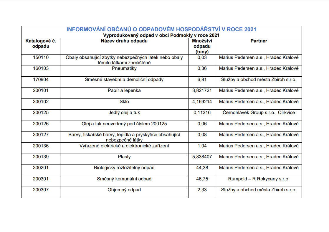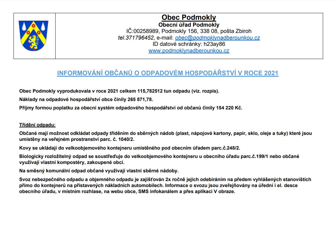 V souladu s § 60 odst. 4 zákona o odpadech informujeme o množství a nákladech za odpadové hospodářství za rok 2021.