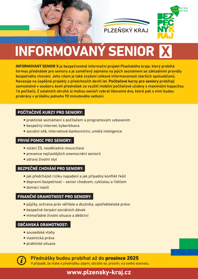 Projekt bude probíhat až do konce letošního roku. Pokud budou mít senioři v naší obci o setkání zájem, nechť zašlou co nejdříve orientační počet účastníků, vybrané okruhy a preferovaný termín setkání Ing. Ivanu Krausovi (tel: 377 195 788, email: ivan.kraus@plzensky-kraj.cz), který zodpoví i případné dotazy.