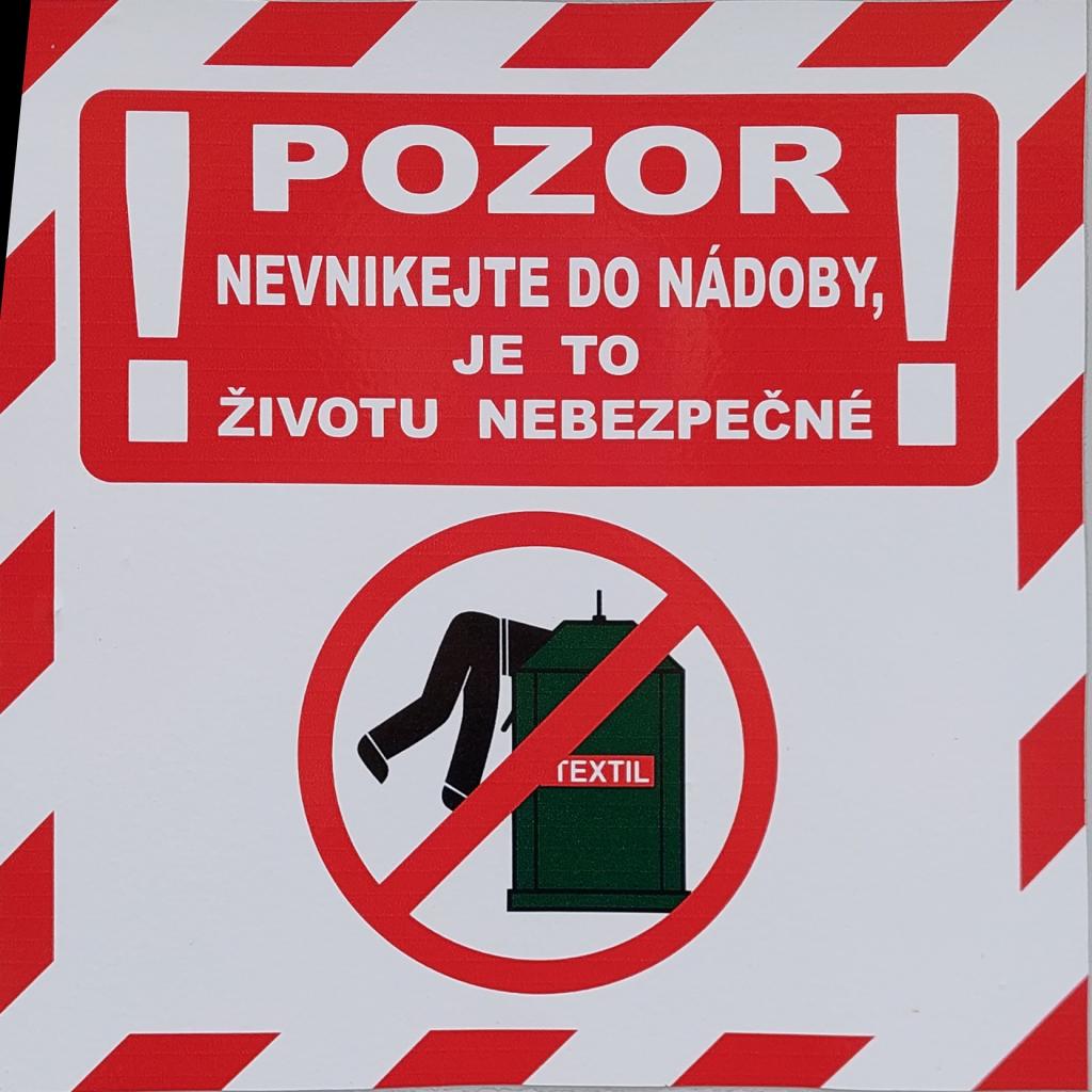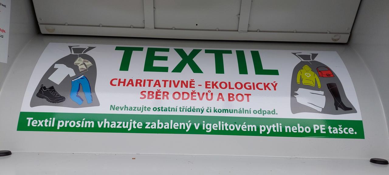 byl umístěn před budovu obecního úřadu. Slouží k odkládání použitého a nepotřebného textilu, bot, ošacení, hraček, ložního prádla a bytového textilu v igelitových taškách nebo PE pytlích.