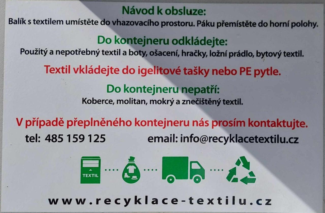 Prosíme všechny občany, aby textil vhazovali do kontejneru zapytlovaný v igelitovém sáčku / pytli / tašce - zamezíte tím zničení textilu a zároveň igelit bude zrecyklován. Nevhazujte prosím textil volně ani v krabicích.