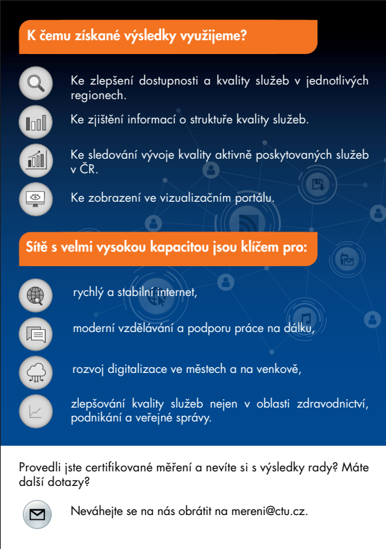 Český telekomunikační úřad zahajuje kampaň „Ověřte kvalitu pevného internetu“. Ve snaze Českého telekomunikačního úřadu je podpořit zkvalitnění služby přístupu k síti internet a získat komplexní informace o její dostupnosti a kvalitě v pevném místě napříč Českou republikou. Cílem je získaná data využít k podpoře budoucího rozvoje a také pro mapovou vizualizaci.