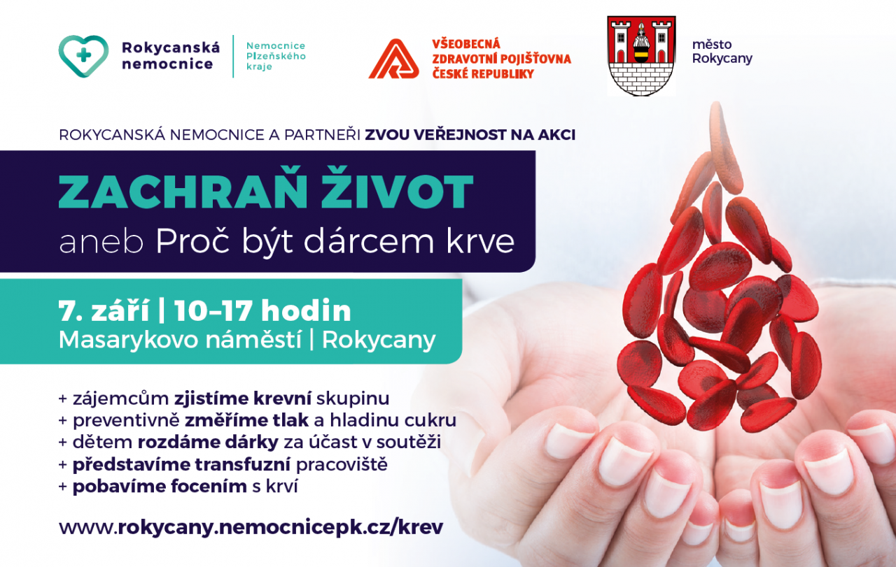 Transfuzní oddělení Rokycanské nemocnice hledá trvale nové pravidelné dárce krve. I když totiž nemocnice eviduje každý rok 60 až 90 prvodárců, z nichž mnozí skutečně začnou chodit opakovaně, je dárců stále málo a jejich řady je třeba neustále rozšiřovat a také omlazovat. Proto i letos nemocnice připravila na úterý 7. září akci „ZACHRAŇ ŽIVOT aneb Proč být dárcem krve?“. Uskuteční se od 10 do 17 hodin na Masarykovo náměstí v Rokycanech. Zastavit se může každý. Zvána je široká veřejnost včetně dětí. Pro všechny je připraven program.