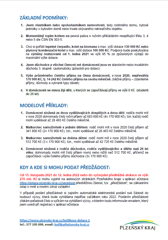 Od 15. listopadu 2021 do 12. ledna 2022 nebo do vyčerpání předběžné alokace ve výši 270 mil. Kč si mohou potenciální žadatelé vyplnit na webových stránkách Plzeňského kraje předběžnou žádost, tzv. „předžádost“, se základními údaji o žadateli a novém zdroji vytápění.