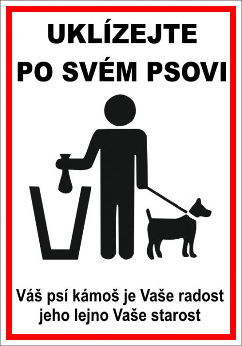 na základě množících se stížností obyvatel obce na neuklizené psí exkrementy v ulicích, před rodinnými domy a dalších místech v obci, apelujeme na chovatele, aby po svých psech uklízeli. Je povinností každého mít s sebou při venčení takové pomůcky, aby mohl úklid zajistit (např. igelitový pytlík, lopatka).