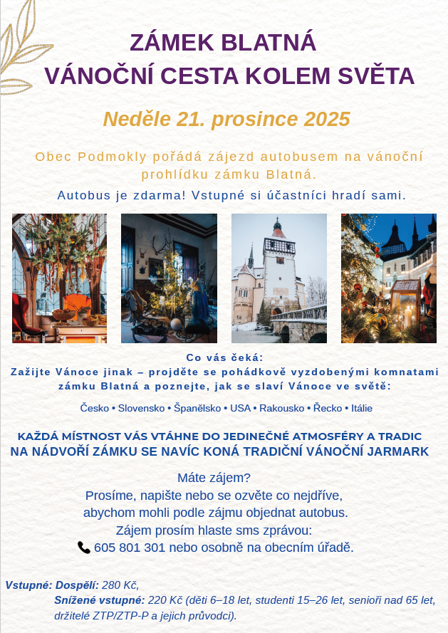 Obec Podmokly pořádá zájezd autobusem na vánoční prohlídku zámku Blatná.